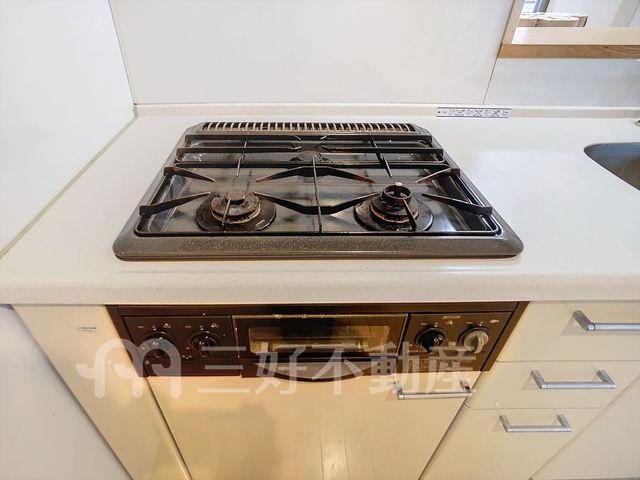 プロパンガス、システムキッチン、給湯、クローゼット、コンロガスコンロ付、コンロ口数二口、シャワー、シャンプードレッサー、シューズボックス、収納、バストイレ別、洗濯機置き場室内有り、洗面所、独立洗面台、トイレ専用(水洗)、バルコニー、バス専用、フローリング、脱衣所、カウンターキッチン