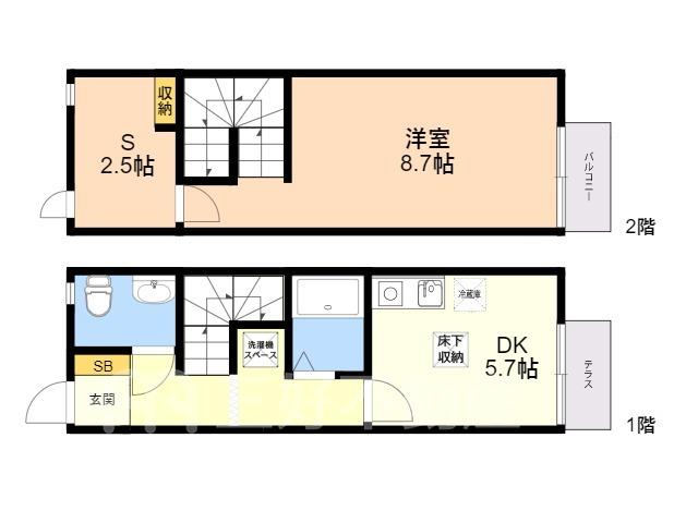 BS放送、CS放送、TVドアホン、TVモニタ付インターフォン、都市ガス、給湯、コンロガスコンロ付、コンロ口数一口、シャッター雨戸、シャワー、シャワートイレ、シューズボックス、バストイレ別、洗濯機置き場室内有り、洗面所、独立洗面台、専用庭、ディンブルキー、トイレ専用(水洗)、バルコニー、バス専用、フローリング、メゾネット、床下収納、エアコン、冷暖房数二基、暖房便座、火災警報器(報知機)