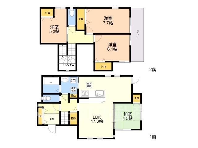 宇美川ぞいの木造2階建て戸建て。オール電化の4LDK。敷地内駐車場3台とれます。